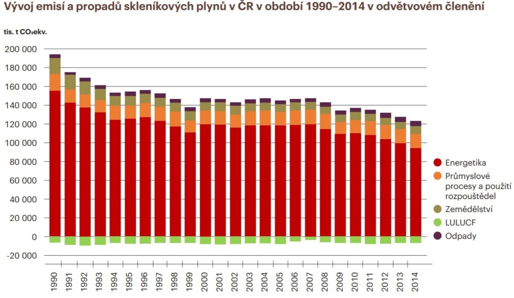 Emise skleníkových plynů v ČR 1990 až 2017, i podle sektoru